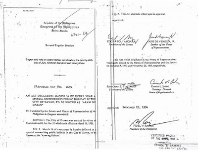 Just in case you don't know and asking whether March 16, 2016, or the 79th Araw ng Dabaw celebration is a special non-working holiday in Davao City, the answer is a big YES!. As a matter of fact, March 16 of every year is a special non-working holiday in Davao City for its celebration of the "Araw ng Dabaw" by virtue of the Republic Act No. 7685. The said Republic Act was approved February 23, 1994 by former President Fidel V. Ramos.